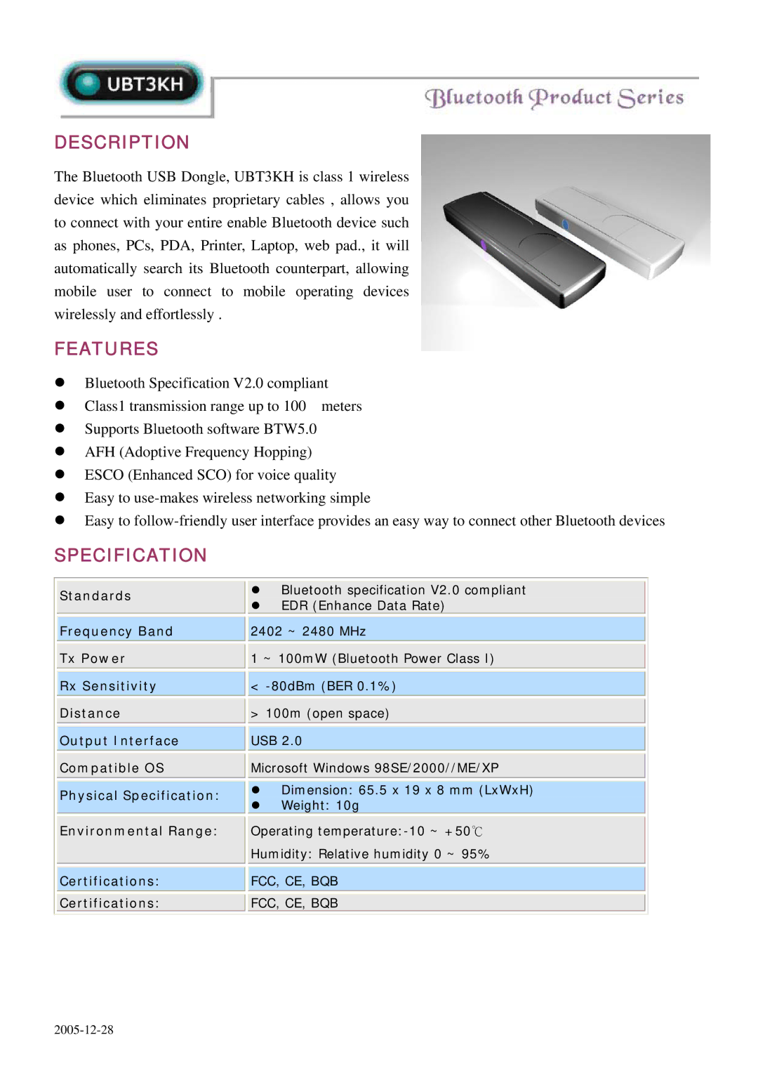 The Bluetooth USB Dongle, UBT3KH is class 1 wireless device which eliminates proprietary cables , allows you to connect with your entire enable Bluetooth device such as phones, PCs, PDA, Printer, Laptop, web pad., it will automatically search its Bluetooth counterpart, allowing mobile user to connect to mobile operating devices wirelessly and effortlessly .
