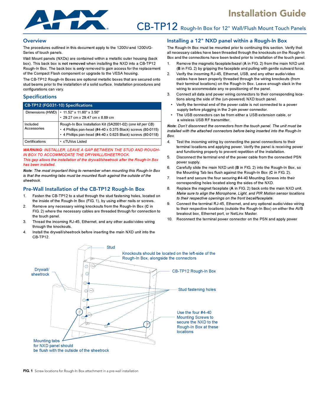 WARNING: INSTALLER, LEAVE A GAP BETWEEN THE STUD AND ROUGH- IN BOX TO ACCOMMODATE THE DRYWALL/SHEETROCK.