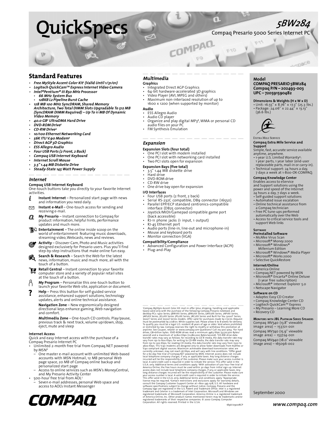1Compaq MyStyle Accent Color Kit mail-in offer (plus shipping, handling and applicable taxes) valid only with the purchase of the following Compaq Presario notebook and desktop PCs: 1400 Series, 5BW1XX Series, 5BW2XX Series, 5WV2XX Series, 7AP1XX Series, 7AP2XX Series, 7EL2XX Series 7PL2XX Series, 7RC2XX Series and Built For You 5000T Series, 7000T Series and 7000Z Series models. Offer valid for purchases made by 1/31/01. Request must be postmarked by 2/28/01. While supplies last. Please allow 6 to 8 weeks for delivery. To qualify, you must be a legal U.S. resident 18 years of age or older. Void where prohibited or restricted by law. Compaq reserves the right to modify or withdraw this promotion at anytime. See Coupon, retailer or www.compaq.com Questions? Call 713-300-3053. 2For hard drives, GB=billion bytes. 3DVD-ROM drives read a minimum 4463 Kbps (4,570,500 Bytes/ second) and a maximum of 10,820 Kbps (11,080,000 Bytes/second). 4CD-RW drive data transfer rates may vary as follows: for recording to CD-R media, the data transfer rate may vary from 150 to 600 Kbps; for writing to CD-RW media, the data transfer rate may vary from 150 to 300 Kbps; for reading CD media, the data transfer rate may vary from 1500 to 3600 Kbps. 5ITU V.90 modems are designed only to allow faster downloads from K56flex or V.90 compliant digital sources. Maximum achievable download transmission rates are currently unknown, may not reach 56 Kbps, and will vary with line conditions. 6Offer good for a 60-day free trial of Compaq.NET powered by MSN. Internet access does not include local telephone company charges, if any, or applicable taxes. Any long distance charges incurred will be the responsibility of the customer. Please make sure your access number is local. A valid credit card is required in order to initiate the service. This offer valid in the U.S.A. only. Additional terms and conditions apply. 7With activation of 500 hour free trial of America Online, the free hours must be used within 30 days from initial sign-up. Internet access does not include local telephone company charges, if any, or applicable taxes. Any long distance charges incurred will be the responsibility of the customer. Please make sure your access number is local. A valid credit card is required in order to initiate the service. This offer valid in the U.S.A. only. Additional terms and conditions apply. 8Appropriate license may be required. 9Certain restrictions and exclusions apply. For warranty details, consult the Compaq Customer Support Center at 1-800-345-1518, U.S. All hardware and software specifications subject to change without notice. Compaq, Presario and the Compaq logo are registered in the U.S. Patent and Trademark Office. Intel is a registered trademark and Celeron is a trademark of Intel Corporation. Microsoft and Windows are registered trademarks of Microsoft Corporation. America Online is a registered trademark of America Online, Inc. Other product names mentioned herein may be trademarks and/or registered trademarks of their respective companies. © 2000 Compaq Computer Corporation. All rights reserved. Printed in the U.S.A.